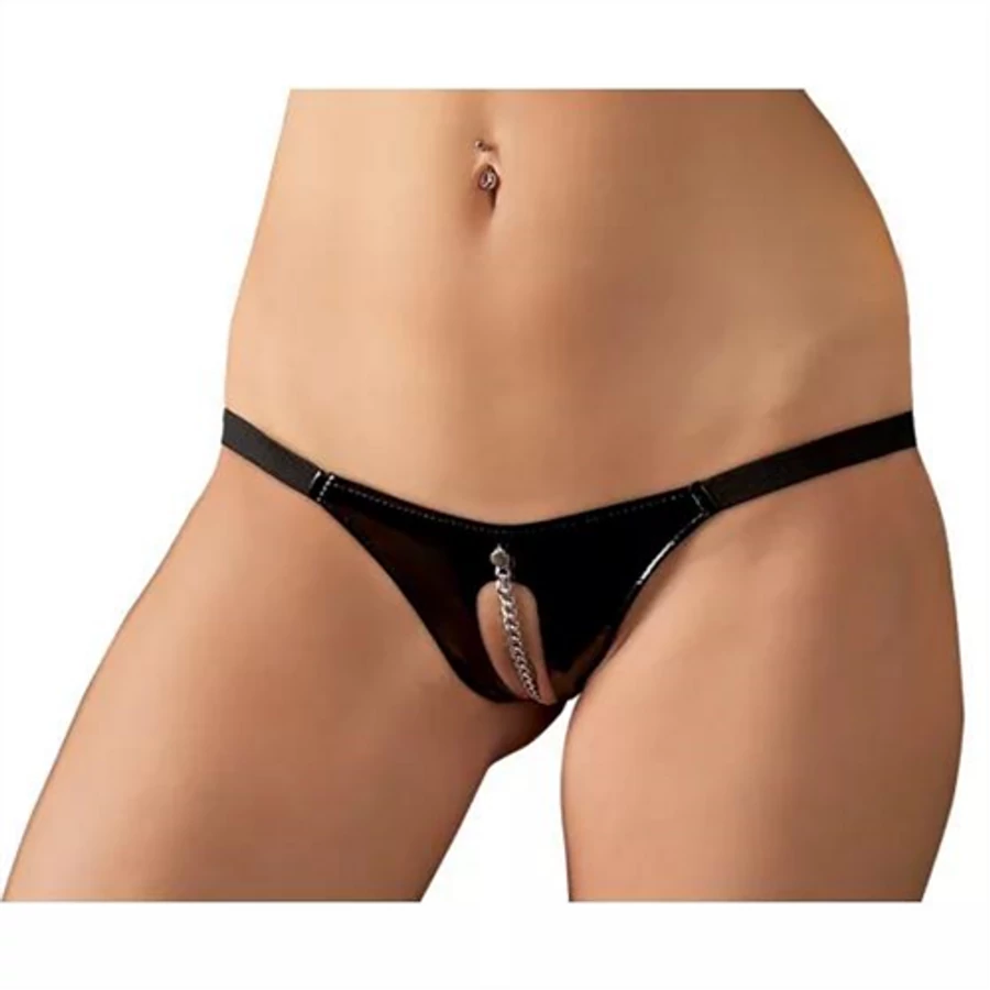 A szeméremnél nyitott kialakítással, melyen ezüst színű fém lánc fut át. A lánc minden egyes lépésnél kellemesen masszírozza a csiklót.