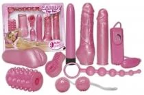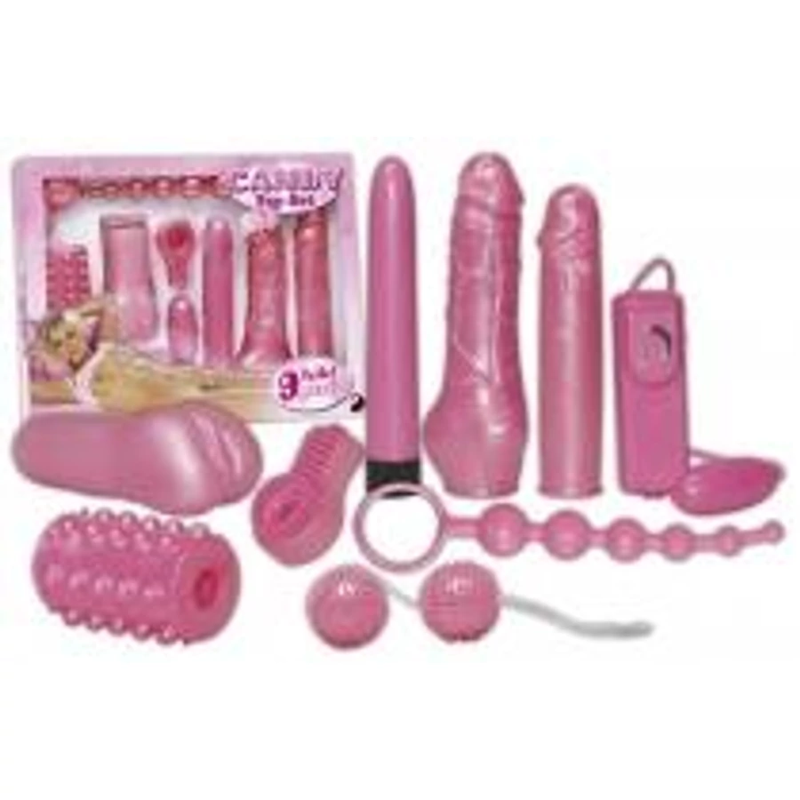 9 részes szexcsomag rugalmas, fényes anyagból. Vibrátor (17cm hosszú, átmérője 2-2,8cm, rezgéserőssége állítható), férfi maszturbátor, péniszgyűrű és -mandzsetta, vibro- és normál kéjgolyók, gyöngyös pálca és még számos specialitás a csomagban páros - vagy egyedüli - élményekhez. Rózsaszín. A termék 4db ceruzaelemmel (4xAA) működik, amit a csomag tartalmaz.