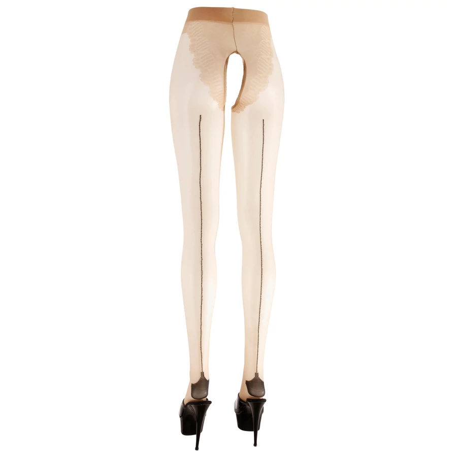 Natúr színben készült, középen nyitott szexharisnya (aktus közben is viselhető), elöl és a fenéken különleges szövéssel, ami olyan mint egy gyönyörű, csipkés alsó. A lábakon hátul szexi, fekete csíkkal, megerősített sarokkal.