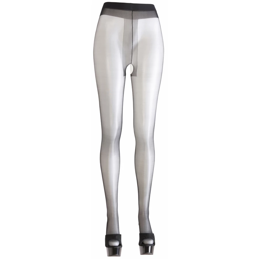 Fekete, szaténos csillogású harisnya, ami szeméremnél nyitott. Formált lábrésszel. 89% Polyamid, 11% Elasthan (Lycra).