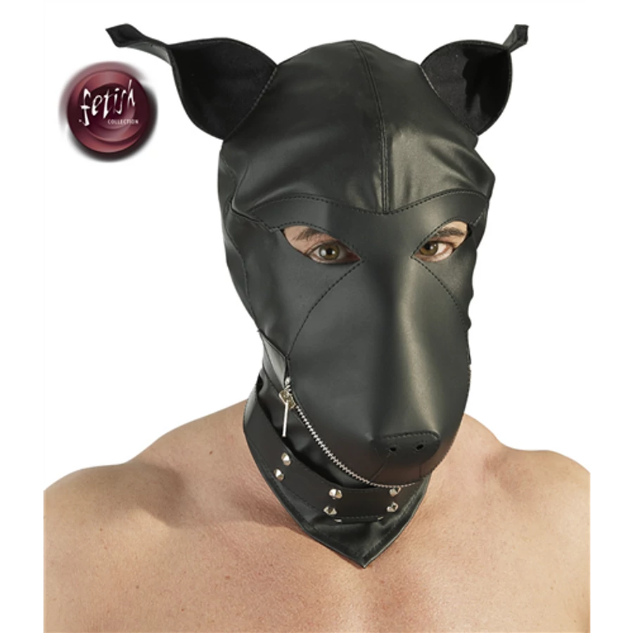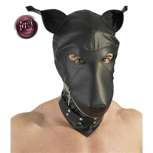 Az arc díszítését szolgáló erotikus kiegészítő, mely a fetish játékok kelléke lehet. Kutyafej formájú maszk az extrém szerepjátékok kedvelőinek!Fekete színű, formázott orral, vágott szemnyílással, a szájnál cipzárral, hegyes fülekkel a fejtetőn. Fém szegecsekkel végigrakott nyakörvvel, melyen fém gyűrű található, pórázcsatlakoztatási lehetőségnek.