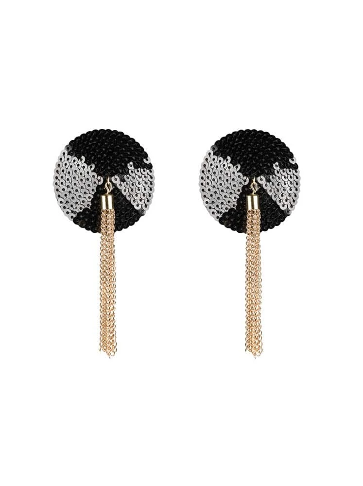 Mellbimbóra ragasztható, flitteres kivitelű, arany színű lánccal kiegészített testdísz. Öntapadós, többször is felhasználható. Átmérőjük 6 cm. A tanga nem része a csomagnak.