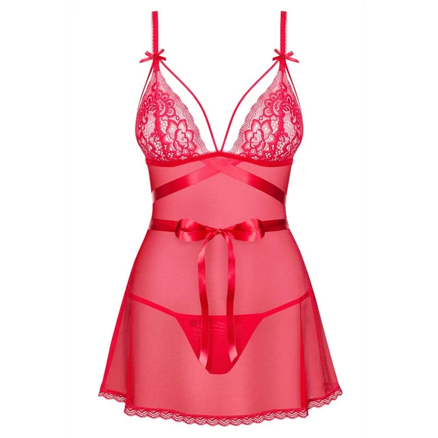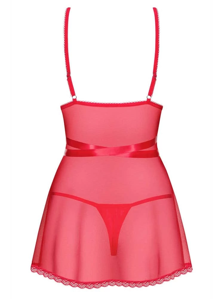 Csipkés szegéllyel díszített, állítható vállpántos, szaténból készült övvel kiegészített, átlátszó babydoll. A csomag a tangát is tartalmazza.
