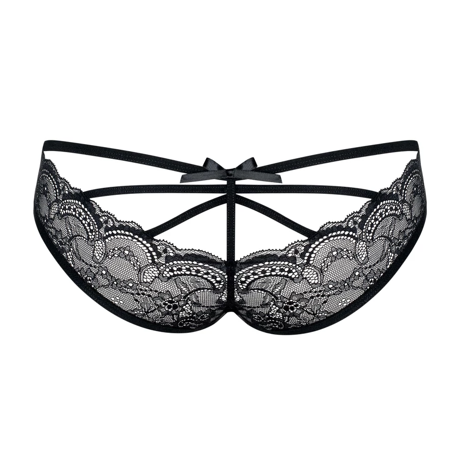 Kellemes, puha, gyönyörű mintákkal díszített, áttetsző csipkéből készülő női alsó, mely elölről klasszikus bugyinak tűnik, azonban hátul szexi kivágásokkal látták el, így a popsi felső részét csupán néhány rugalmas pánt és egy szatén masni takarja.