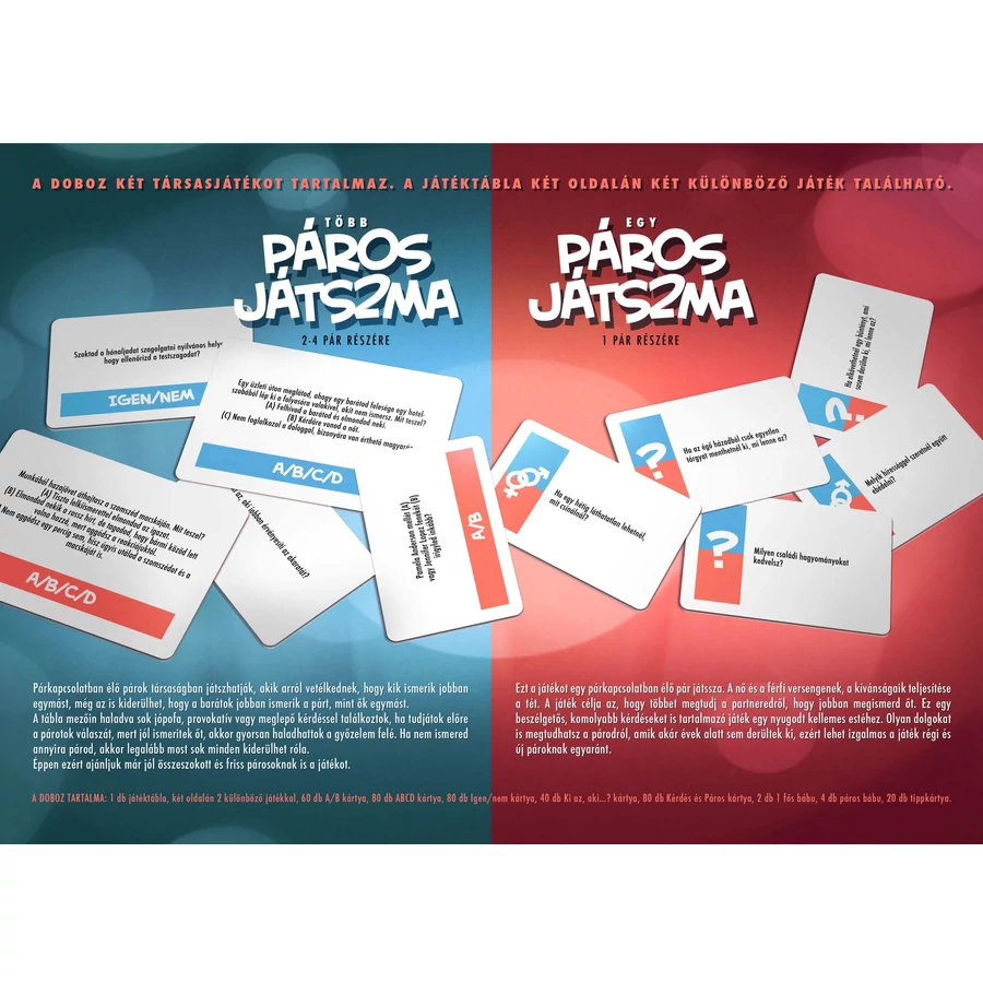 A Páros játszma nem csak egy, hanem két játékot rejt magában, így édes kettesben, vagy baráti körrel is tökéletesen játszható!